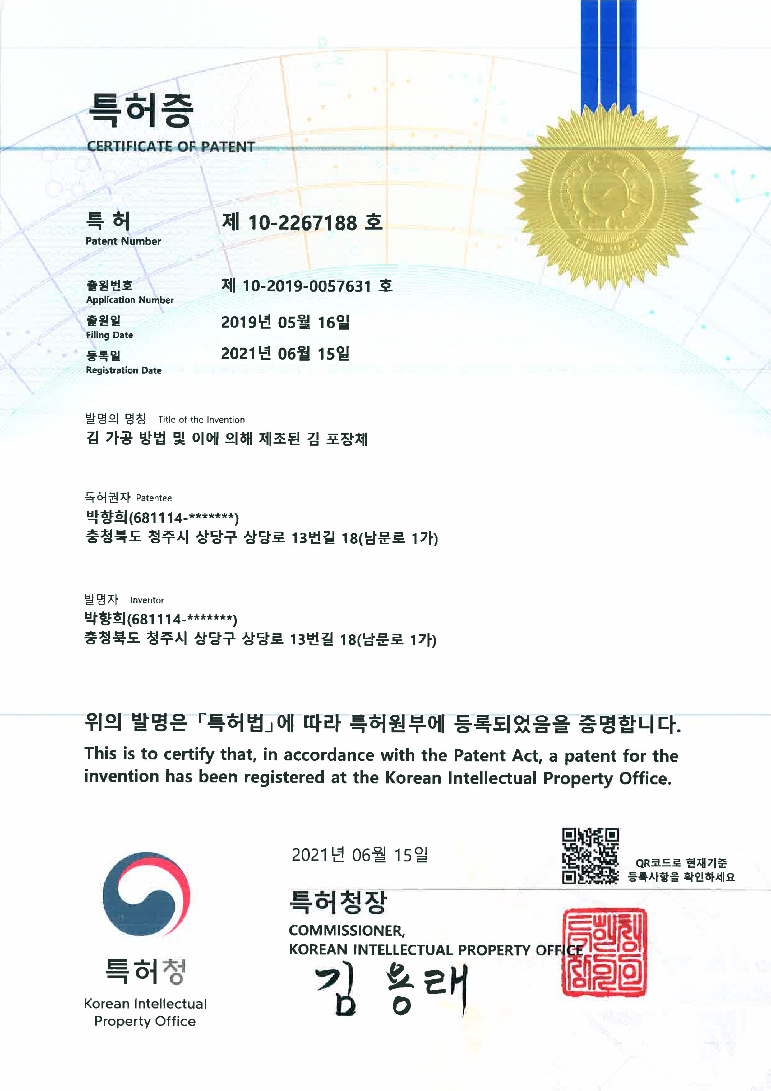 - [Patenturkunde] Verarbeitungsmethode für Gim und daraus hergestellte Verpackungseinheiten